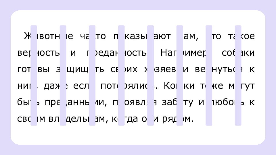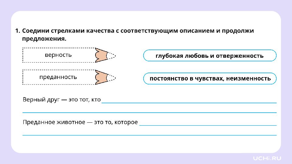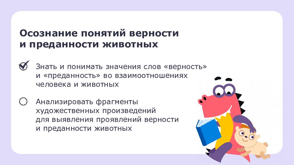 Осознание понятий верности и преданности животных Знать и понимать значения слов «верность» и «преданность» во взаимоотношениях человека и животных Анализировать фрагменты художественных произведений для выявления проявлений верности и преданности животных