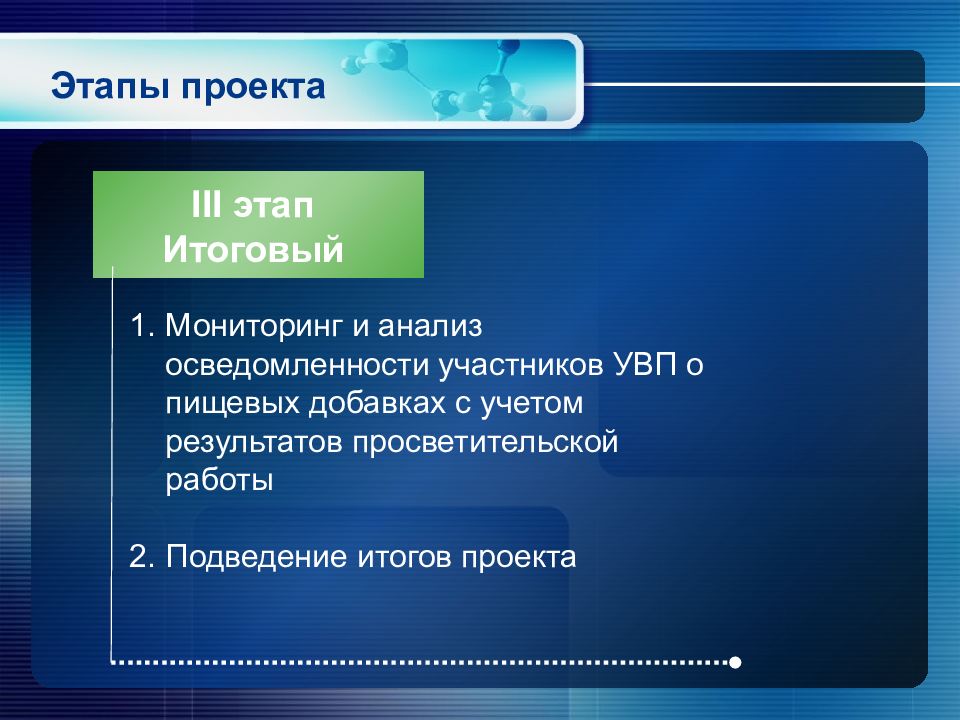 ІІІ этап Итоговый Мониторинг и анализ осведомленности участников УВП о пищевых добавках с учетом результатов просветительской работы Подведение итогов проекта
