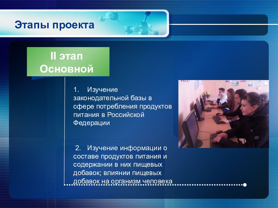 ІІ этап Основной 1. Изучение законодательной базы в сфере потребления продуктов питания в Российской Федерации 2. Изучение информации о составе продуктов питания и содержании в них пищевых добавок; влиянии пищевых добавок на организм человека