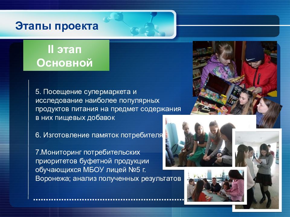 ІІ этап Основной 5. Посещение супермаркета и исследование наиболее популярных продуктов питания на предмет содержания в них пищевых добавок 6. Изготовление памяток потребителя 7.Мониторинг потребительских приоритетов буфетной продукции обучающихся МБОУ лицей №5 г. Воронежа; анализ полученных результатов