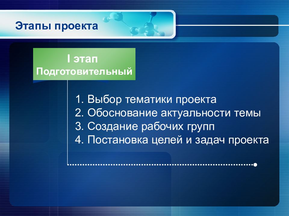 І этап Подготовительный 1. Выбор тематики проекта 2. Обоснование актуальности темы 3. Создание рабочих групп 4. Постановка целей и задач проекта