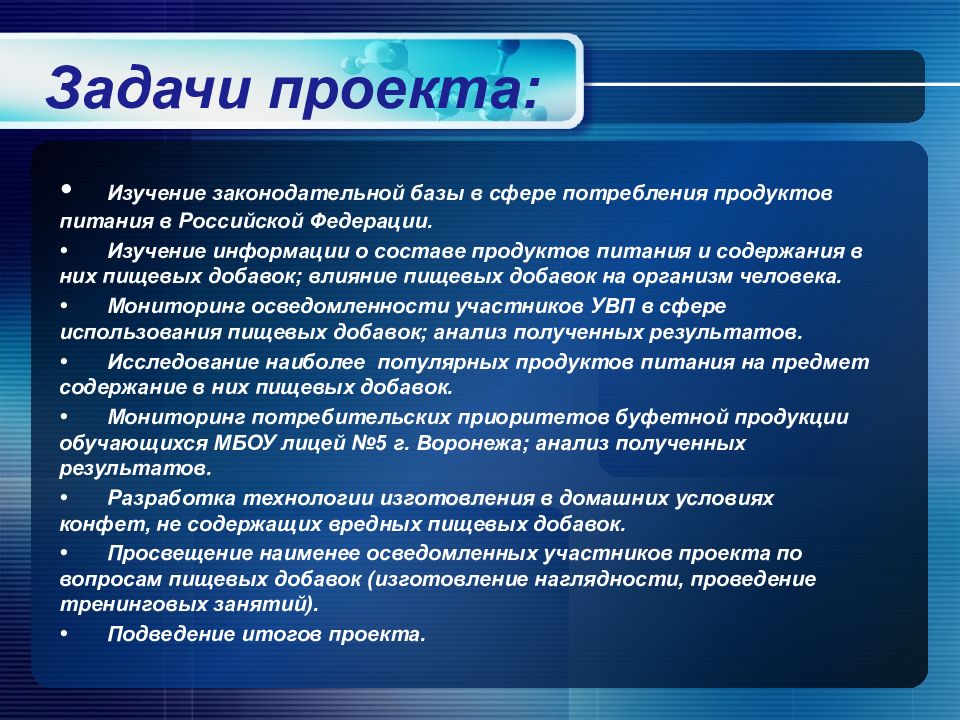 • Изучение законодательной базы в сфере потребления продуктов питания в Российской Федерации. • Изучение информации о составе продуктов питания и содержания в них пищевых добавок; влияние пищевых добавок на организм человека. • Мониторинг осведомленности участников УВП в сфере использования пищевых добавок; анализ полученных результатов. • Исследование наиболее популярных продуктов питания на предмет содержание в них пищевых добавок. • Мониторинг потребительских приоритетов буфетной продукции обучающихся МБОУ лицей №5 г. Воронежа; анализ полученных результатов. • Разработка технологии изготовления в домашних условиях конфет, не содержащих вредных пищевых добавок. • Просвещение наименее осведомленных участников проекта по вопросам пищевых добавок (изготовление наглядности, проведение тренинговых занятий). • Подведение итогов проекта. Задачи проекта: