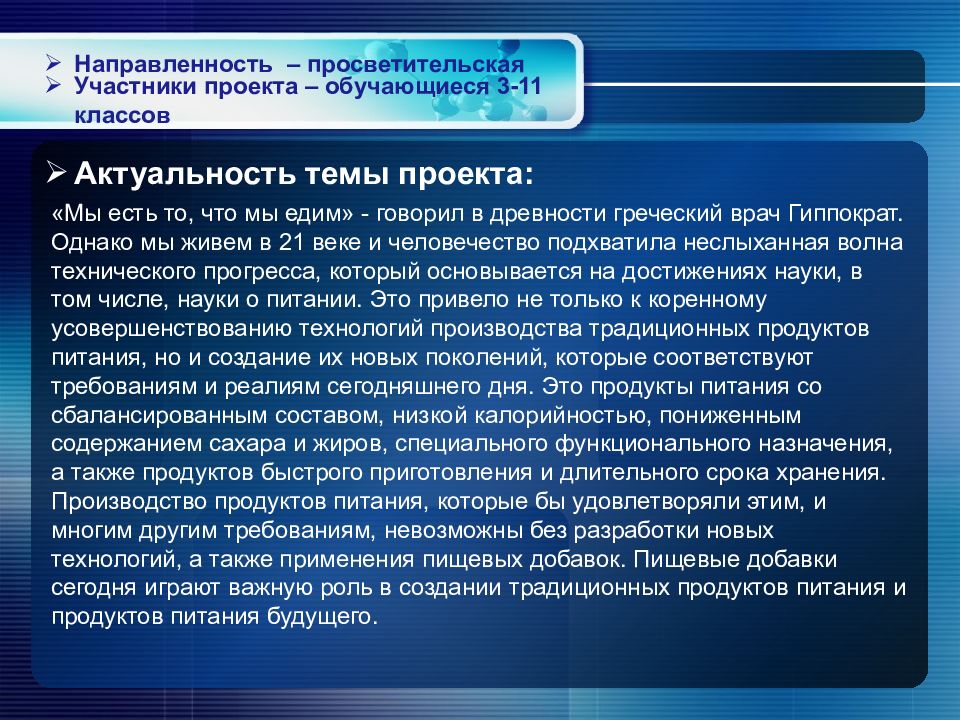 Актуальность темы проекта : Направленность – просветительская «Мы есть то, что мы едим» - говорил в древности греческий врач Гиппократ. Однако мы живем в 21 веке и человечество подхватила неслыханная волна технического прогресса, который основывается на достижениях науки, в том числе, науки о питании. Это привело не только к коренному усовершенствованию технологий производства традиционных продуктов питания, но и создание их новых поколений, которые соответствуют требованиям и реалиям сегодняшнего дня. Это продукты питания со сбалансированным составом, низкой калорийностью, пониженным содержанием сахара и жиров, специального функционального назначения, а также продуктов быстрого приготовления и длительного срока хранения. Производство продуктов питания, которые бы удовлетворяли этим, и многим другим требованиям, невозможны без разработки новых технологий, а также применения пищевых добавок. Пищевые добавки сегодня играют важную роль в создании традиционных продуктов питания и продуктов питания будущего. Участники проекта – обучающиеся 3-11 классов