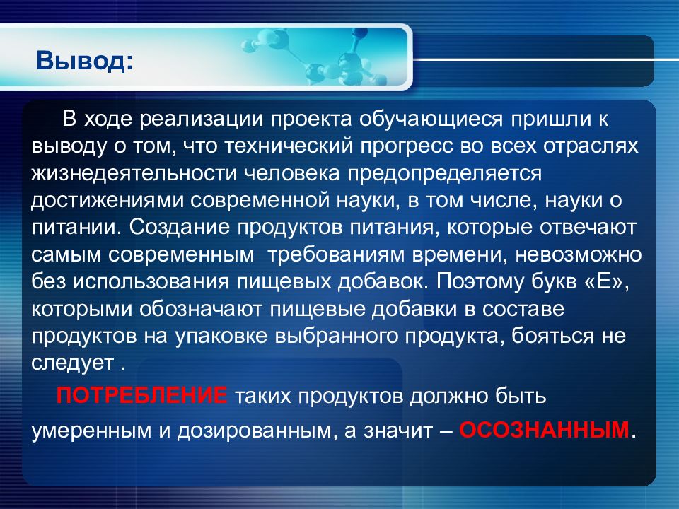В ходе реализации проекта обучающиеся пришли к выводу о том, что технический прогресс во всех отраслях жизнедеятельности человека предопределяется достижениями современной науки, в том числе, науки о питании. Создание продуктов питания, которые отвечают самым современным требованиям времени, невозможно без использования пищевых добавок. Поэтому букв «Е», которыми обозначают пищевые добавки в составе продуктов на упаковке выбранного продукта, бояться не следует. ПОТРЕБЛЕНИЕ таких продуктов должно быть умеренным и дозированным, а значит – ОСОЗНАННЫМ.