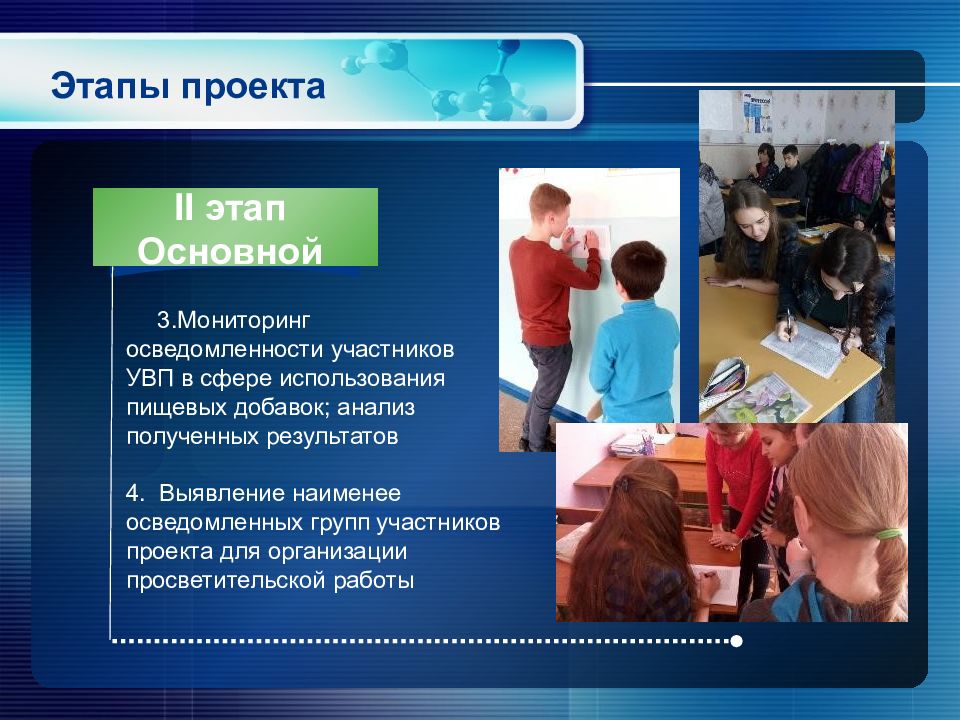 ІІ этап Основной Мониторинг осведомленности участников УВП в сфере использования пищевых добавок; анализ полученных результатов 4. Выявление наименее осведомленных групп участников проекта для организации просветительской работы