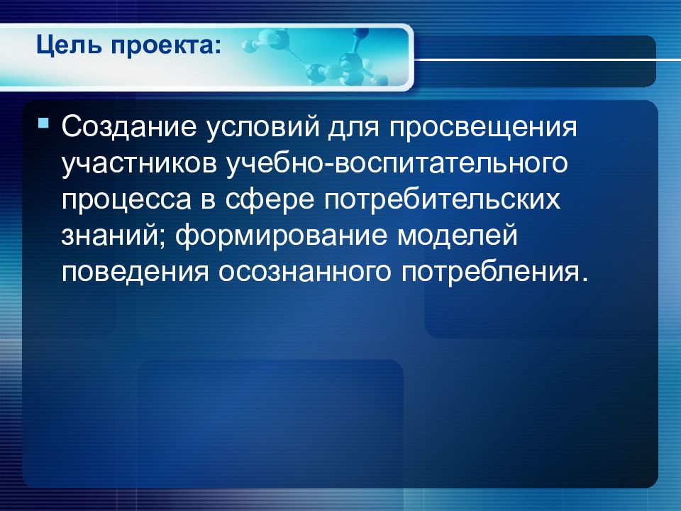 Создание условий для просвещения участников учебно-воспитательного процесса в сфере потребительских знаний; формирование моделей поведения осознанного потребления.