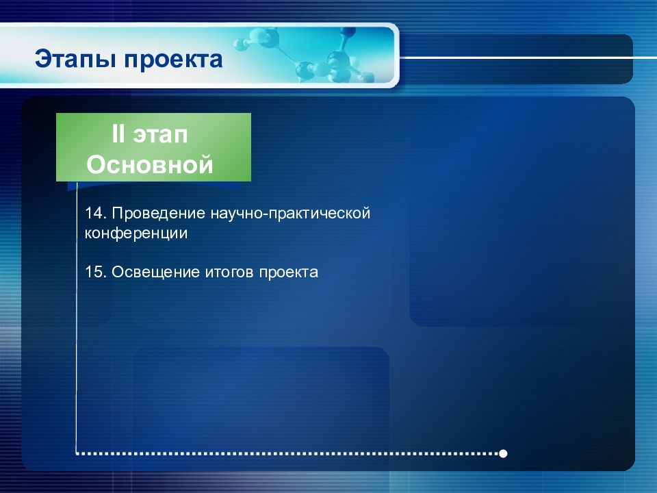 ІІ этап Основной 14. Проведение научно-практической конференции 15. Освещение итогов проекта