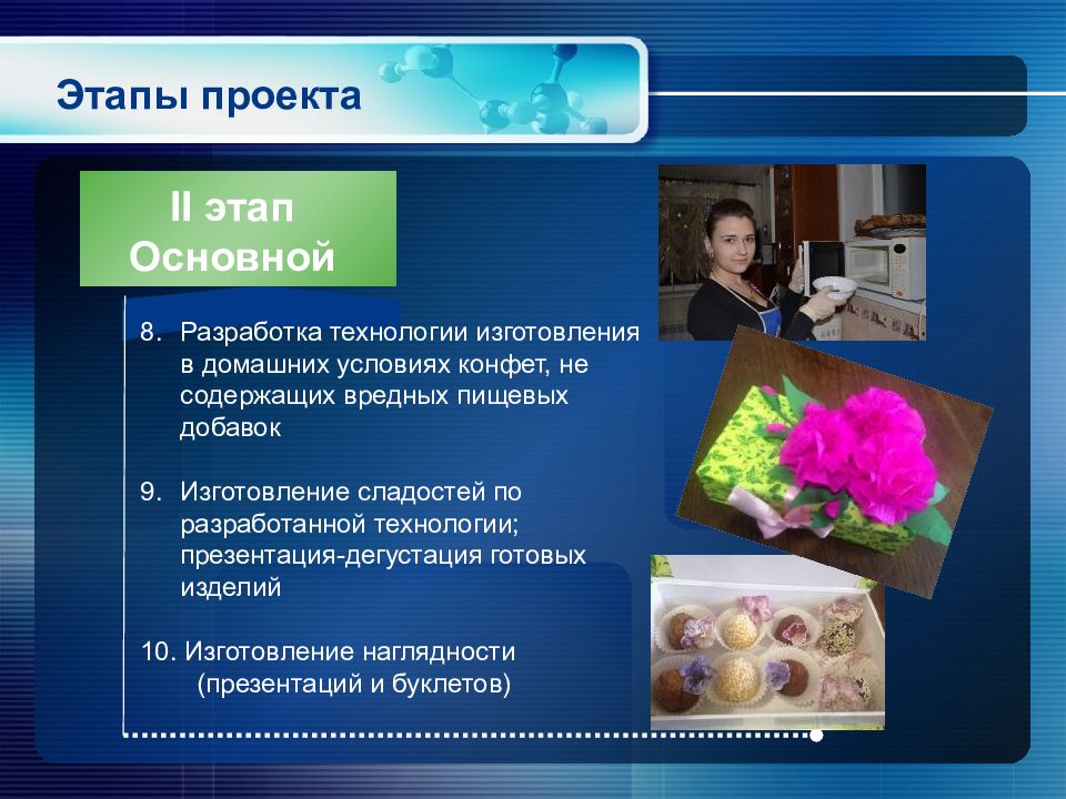 ІІ этап Основной Разработка технологии изготовления в домашних условиях конфет, не содержащих вредных пищевых добавок Изготовление сладостей по разработанной технологии; презентация-дегустация готовых изделий 10. Изготовление наглядности (презентаций и буклетов)