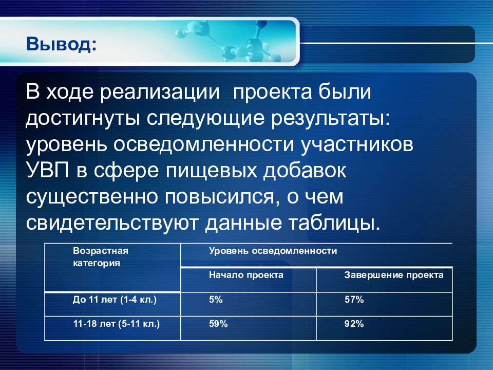 В ходе реализации проекта были достигнуты следующие результаты: уровень осведомленности участников УВП в сфере пищевых добавок существенно повысился, о чем свидетельствуют данные таблицы. Возрастная категория Уровень осведомленности Начало проекта Завершение проекта До 11 лет (1-4 кл.) 5% 57% 11-18 лет (5-11 кл.) 59% 92%