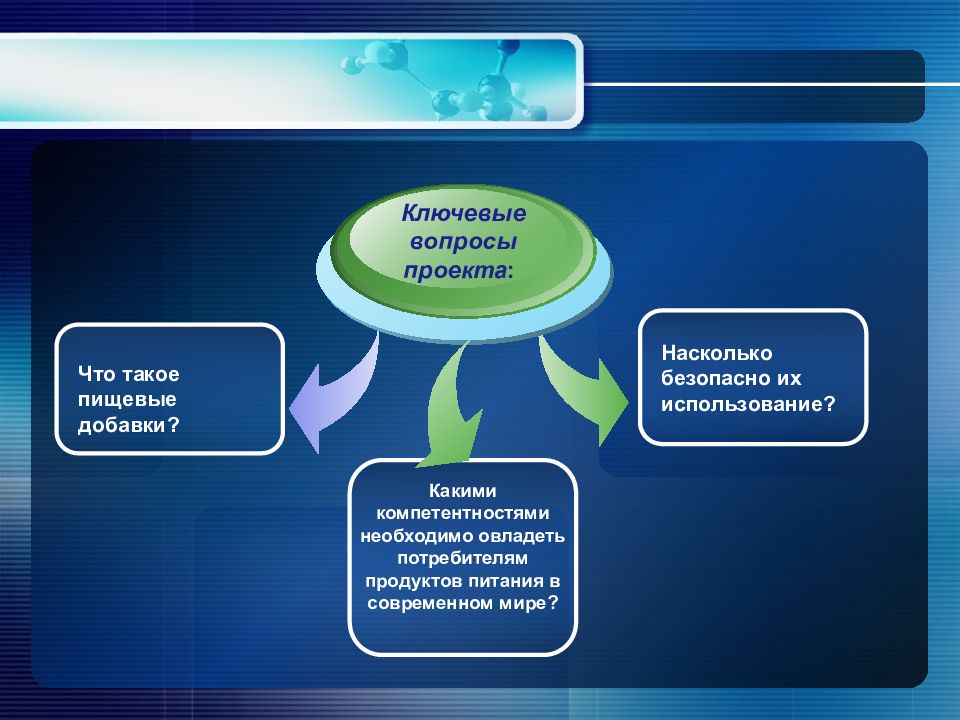 Насколько безопасно их использование ? Что такое пищевые добавки? Ключевые вопросы проекта : Какими компетентностями необходимо овладеть потребителям продуктов питания в современном мире?