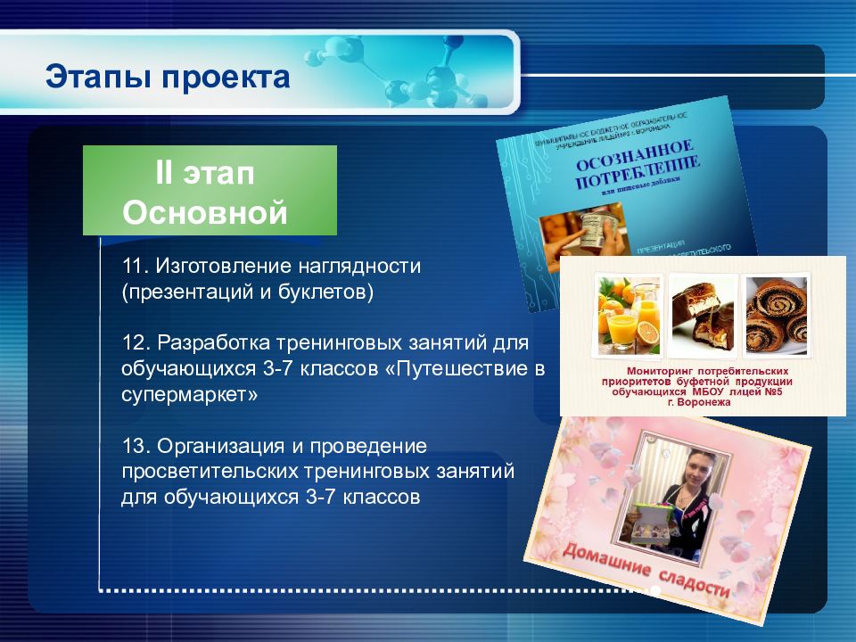 ІІ этап Основной 11. Изготовление наглядности (презентаций и буклетов) 12. Разработка тренинговых занятий для обучающихся 3-7 классов «Путешествие в супермаркет» 13. Организация и проведение просветительских тренинговых занятий для обучающихся 3-7 классов