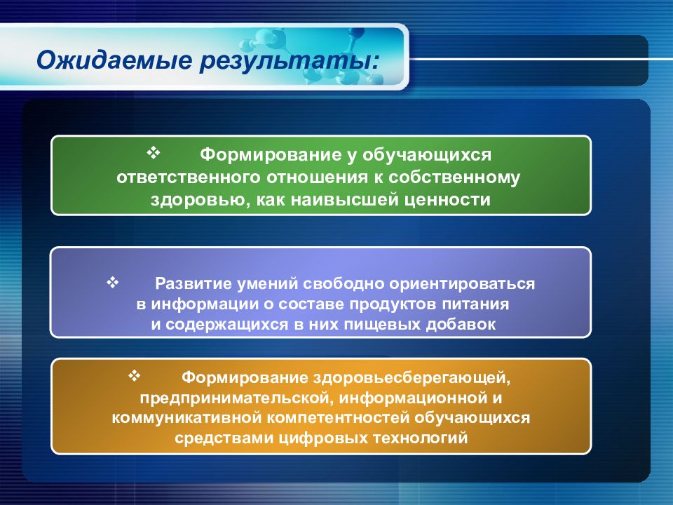 Формирование у обучающихся ответственного отношения к собственному здоровью, как наивысшей ценности Развитие умений свободно ориентироваться в информации о составе продуктов питания и содержащихся в них пищевых добавок Формирование здоровьесберегающей, предпринимательской, информационной и коммуникативной компетентностей обучающихся средствами цифровых технологий Ожидаемые результаты :