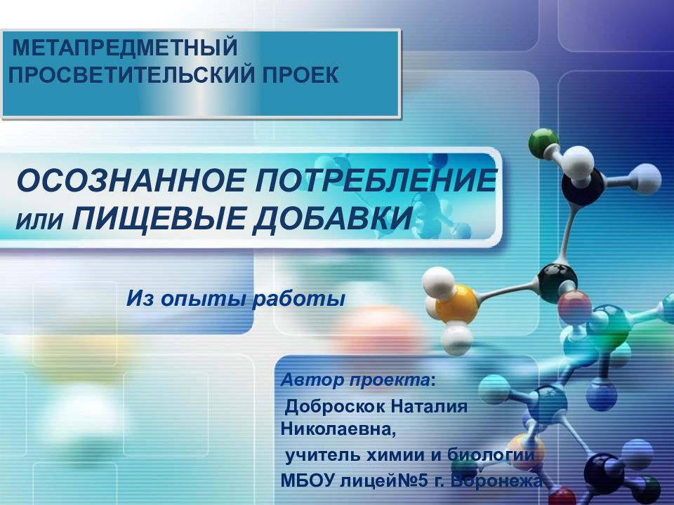 Автор проекта : Доброскок Наталия Николаевна, учитель химии и биологии МБОУ лицей№5 г. Воронежа МЕТАПРЕДМЕТНЫЙ ПРОСВЕТИТЕЛЬСКИЙ ПРОЕК Из опыты работы