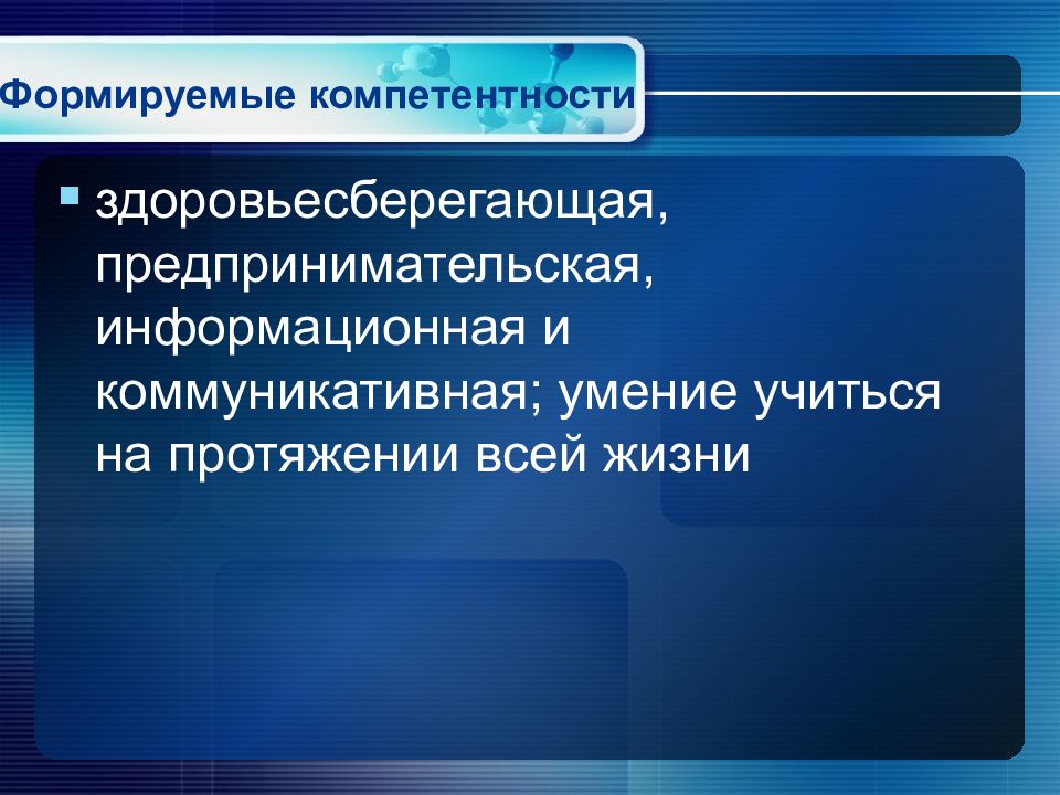 здоровьесберегающая, предпринимательская, информационная и коммуникативная; умение учиться на протяжении всей жизни