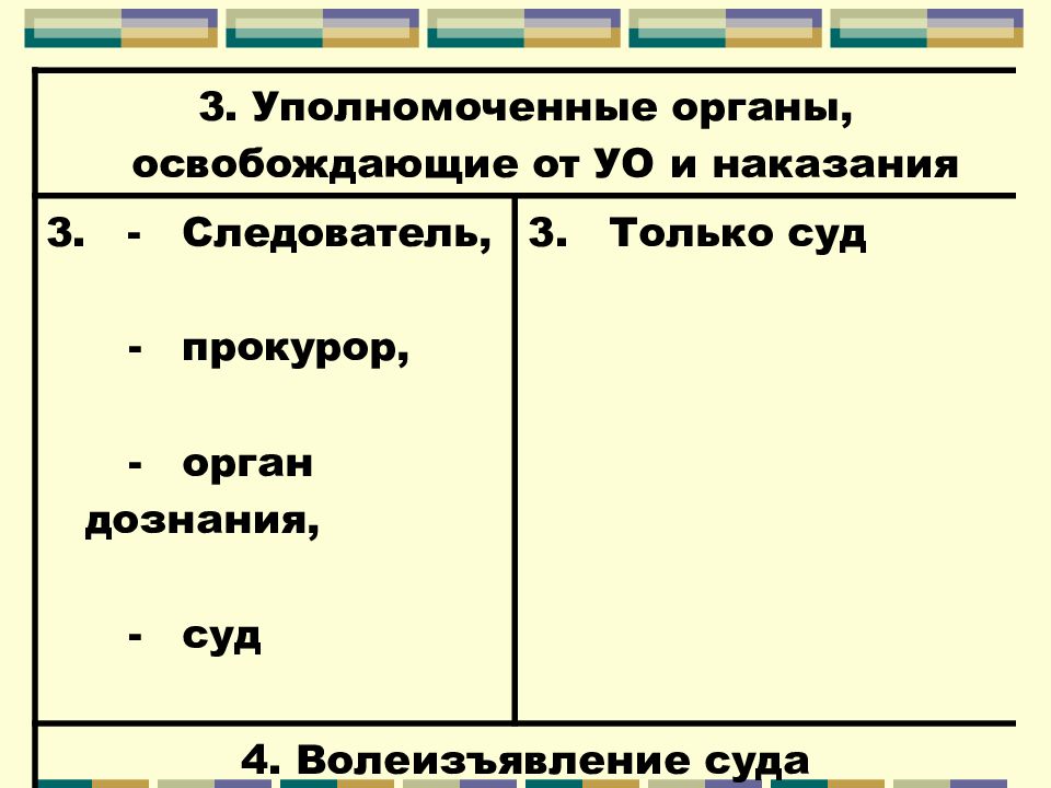 3. Уполномоченные органы, освобождающие от УО и наказания 3. - Следователь, - прокурор, - орган дознания, - суд 3. Только суд 4. Волеизъявление суда 4. Это право суда, а не обязанность 4. Это право суда, а не обязанность 5. Наличие судимости 5. Не влечет судимости 5. Влечет судимость