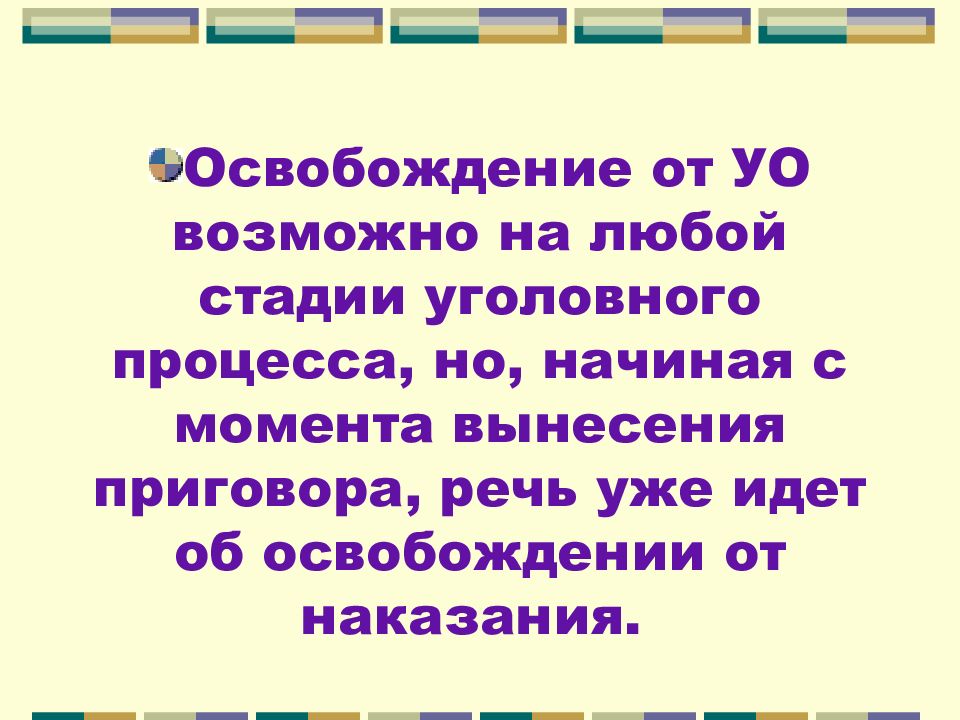 Освобождение от УО возможно на любой стадии уголовного процесса, но, начиная с момента вынесения приговора, речь уже идет об освобождении от наказания.
