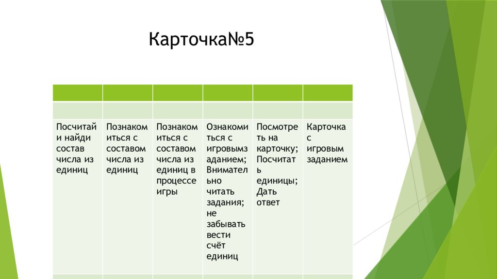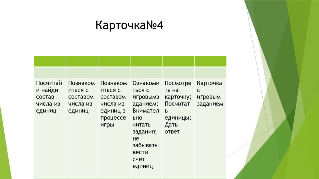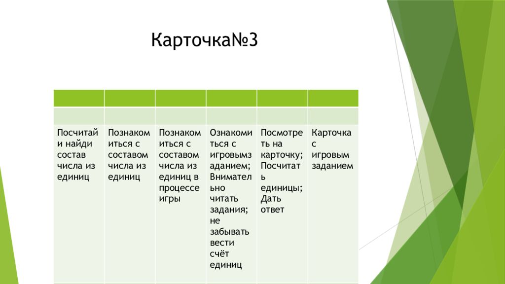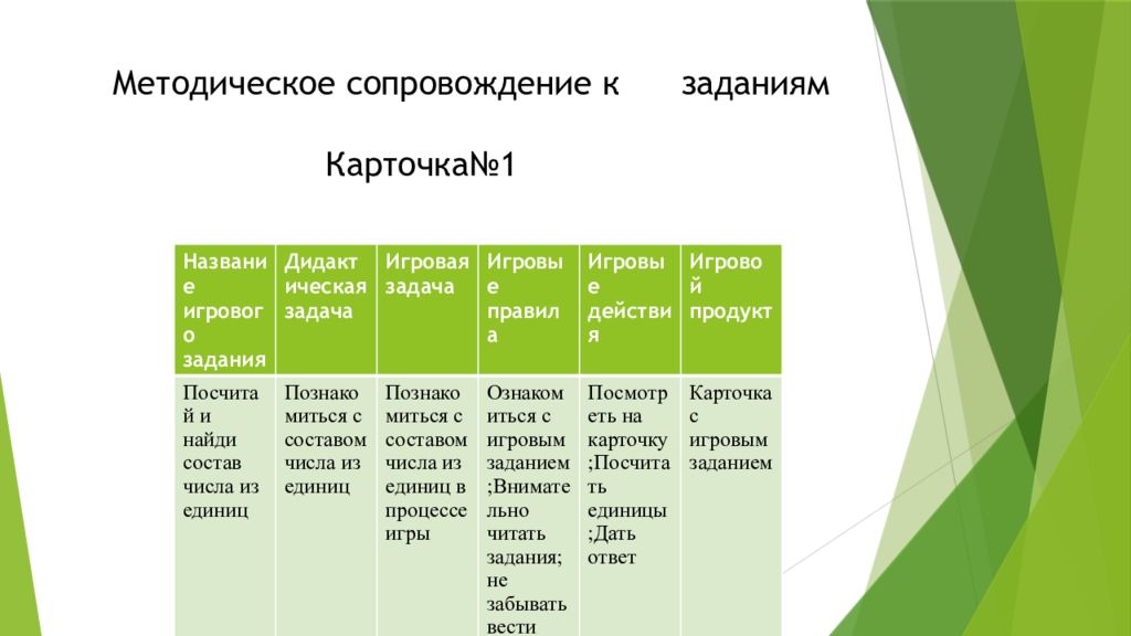 Название игрового задания Дидактическая задача Игровая задача Игровые правила Игровые действия Игровой продукт Посчитай и найди состав числа из единиц Познакомиться с составом числа из единиц Познакомиться с составом числа из единиц в процессе игры Ознакомиться с игровымзаданием ; Внимательно читать задания ; не забывать вести счёт единиц Посмотреть на карточку ; Посчитать единицы ; Дать ответ Карточка с игровым заданием