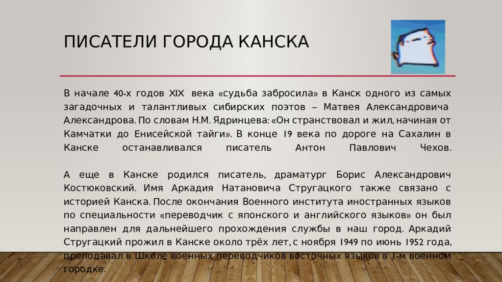В начале 40-х годов XIX века «судьба забросила» в Канск одного из самых загадочных и талантливых сибирских поэтов – Матвея Александровича Александрова. По словам Н.М. Ядринцева: «Он странствовал и жил, начиная от Камчатки до Енисейской тайги». В конце 19 века по дороге на Сахалин в Канске останавливался писатель Антон Павлович Чехов. А еще в Канске родился писатель, драматург Борис Александрович Костюковский. Имя Аркадия Натановича Стругацкого также связано с историей Канска. После окончания Военного института иностранных языков по специальности «переводчик с японского и английского языков» он был направлен для дальнейшего прохождения службы в наш город. Аркадий Стругацкий прожил в Канске около трёх лет, с ноября 1949 по июнь 1952 года, преподавал в Школе военных переводчиков восточных языков в 1-м военном городке.