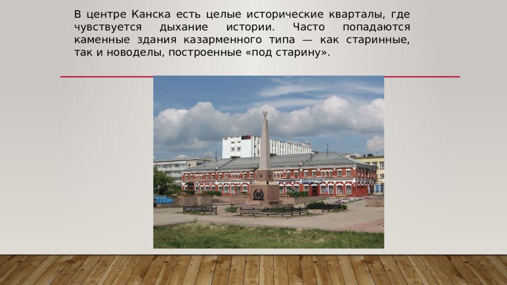 В центре Канска есть целые исторические кварталы, где чувствуется дыхание истории. Часто попадаются каменные здания казарменного типа — как старинные, так и новоделы, построенные «под старину ».