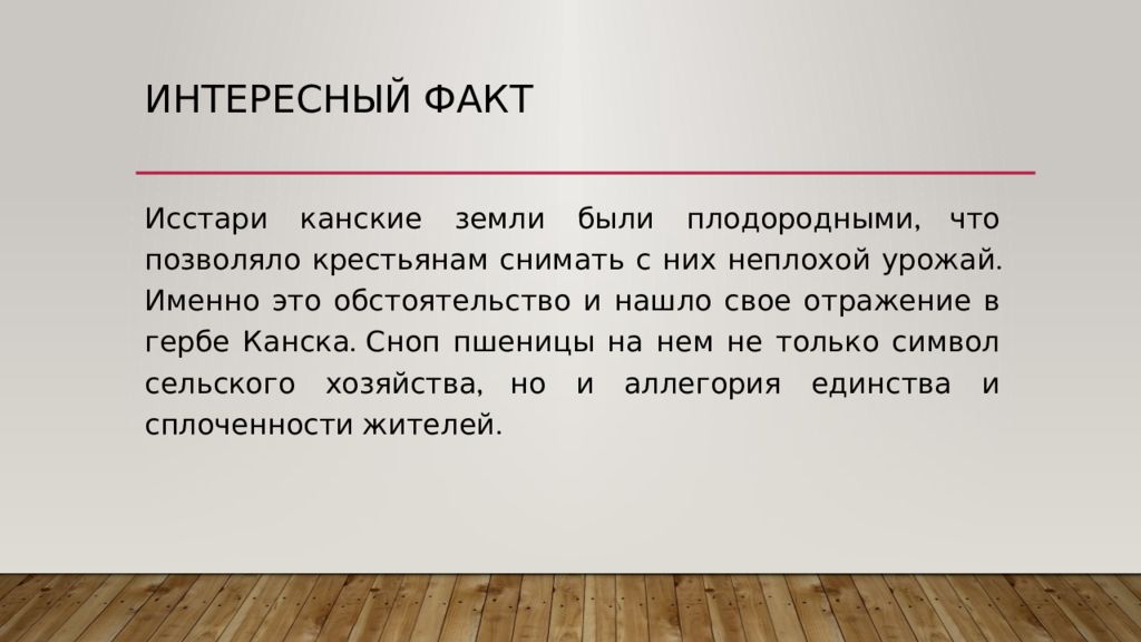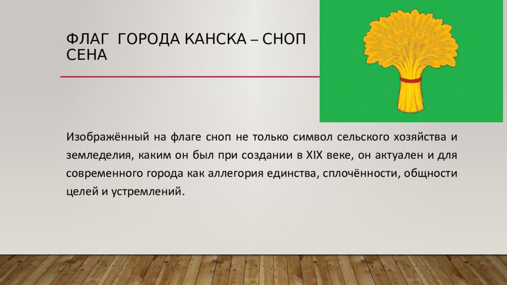 Исстари канские земли были плодородными, что позволяло крестьянам снимать с них неплохой урожай. Именно это обстоятельство и нашло свое отражение в гербе Канска. Сноп пшеницы на нем не только символ сельского хозяйства, но и аллегория единства и сплоченности жителей.