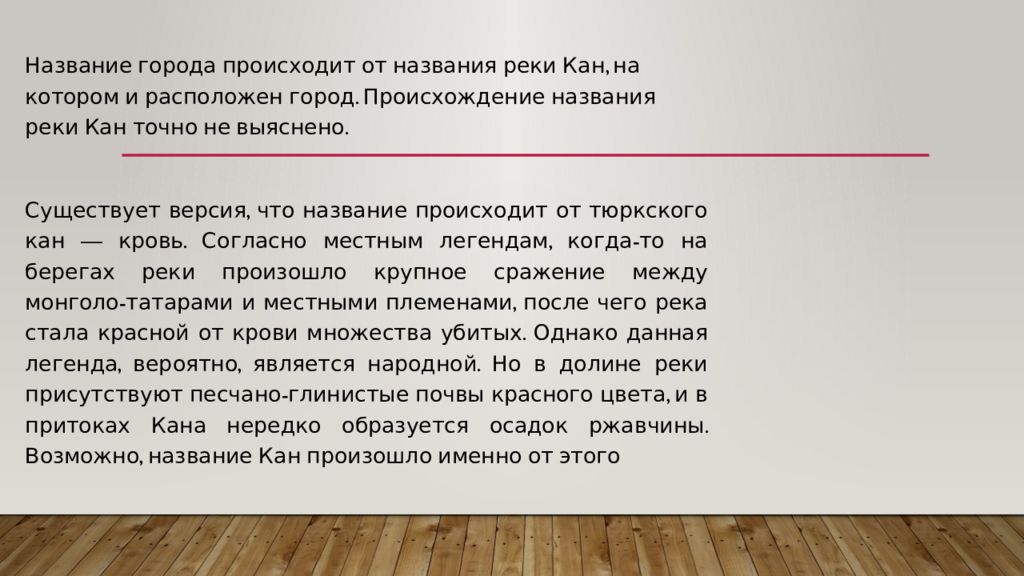 Название города происходит от названия реки Кан, на котором и расположен город. Происхождение названия реки Кан точно не выяснено. Существует версия, что название происходит от тюркского кан — кровь. Согласно местным легендам, когда-то на берегах реки произошло крупное сражение между монголо-татарами и местными племенами, после чего река стала красной от крови множества убитых. Однако данная легенда, вероятно, является народной. Но в долине реки присутствуют песчано-глинистые почвы красного цвета, и в притоках Кана нередко образуется осадок ржавчины. Возможно, название Кан произошло именно от этого