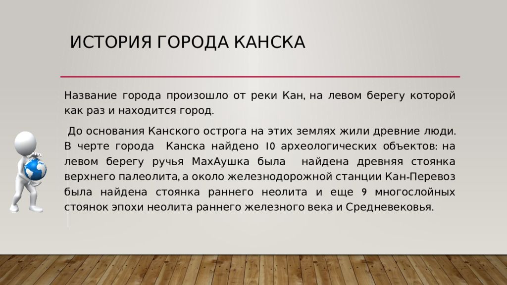 Название города произошло от реки Кан, на левом берегу которой как раз и находится город. До основания Канского острога на этих землях жили древние люди. В черте города Канска найдено 10 археологических объектов: на левом берегу ручья МахАушка была найдена древняя стоянка верхнего палеолита, а около железнодорожной станции Кан-Перевоз была найдена стоянка раннего неолита и еще 9 многослойных стоянок эпохи неолита раннего железного века и Средневековья.