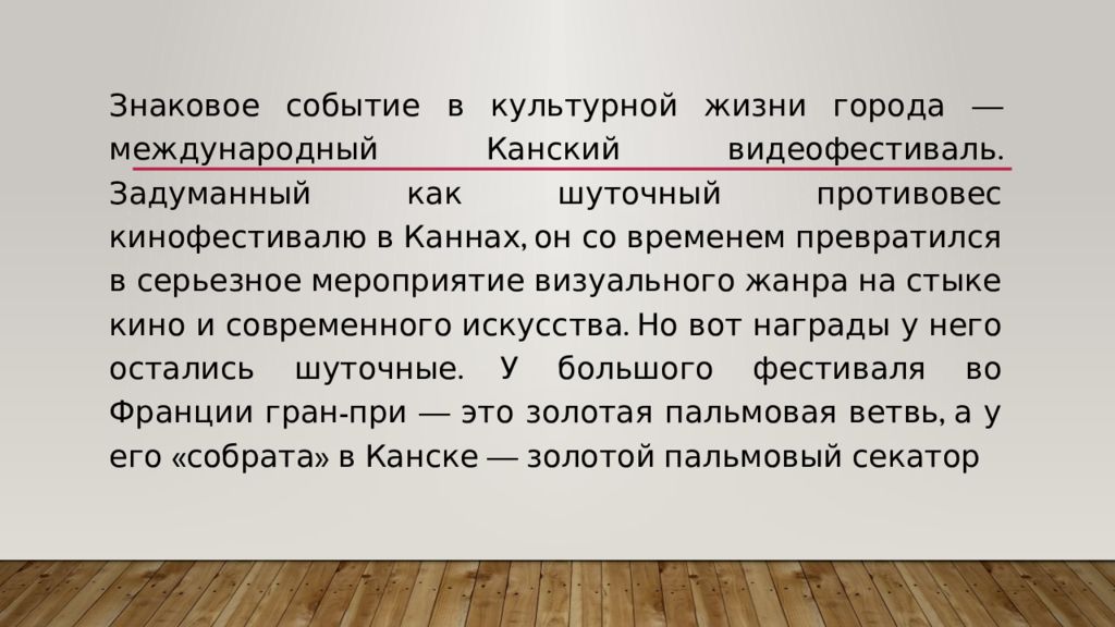 Знаковое событие в культурной жизни города — международный Канский видеофестиваль. Задуманный как шуточный противовес кинофестивалю в Каннах, он со временем превратился в серьезное мероприятие визуального жанра на стыке кино и современного искусства. Но вот награды у него остались шуточные. У большого фестиваля во Франции гран-при — это золотая пальмовая ветвь, а у его «собрата» в Канске — золотой пальмовый секатор