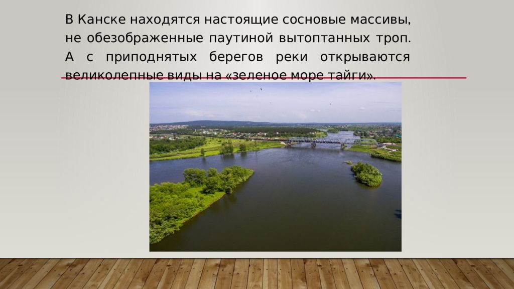 В Канске находятся настоящие сосновые массивы, не обезображенные паутиной вытоптанных троп. А с приподнятых берегов реки открываются великолепные виды на «зеленое море тайги ».