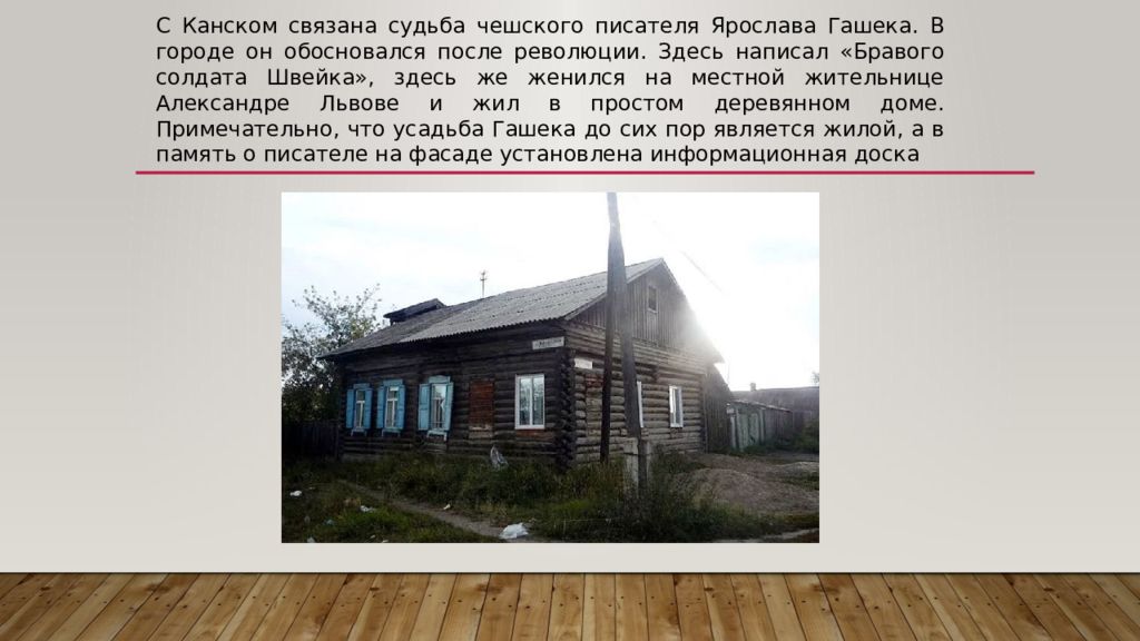 С Канском связана судьба чешского писателя Ярослава Гашека. В городе он обосновался после революции. Здесь написал «Бравого солдата Швейка», здесь же женился на местной жительнице Александре Львове и жил в простом деревянном доме. Примечательно, что усадьба Гашека до сих пор является жилой, а в память о писателе на фасаде установлена информационная доска