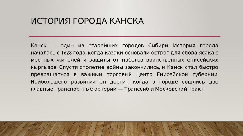Канск — один из старейших городов Сибири. История города началась с 1628 года, когда казаки основали острог для сбора ясака с местных жителей и защиты от набегов воинственных енисейских кыргызов. Спустя столетие войны закончились, и Канск стал быстро превращаться в важный торговый центр Енисейской губернии. Наибольшего развития он достиг, когда в городе сошлись две главные транспортные артерии — Транссиб и Московский тракт