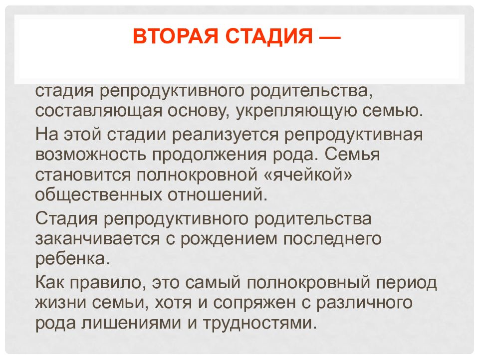 стадия репродуктивного родительства, составляющая основу, укрепляющую семью. На этой стадии реализуется репродуктивная возможность продолжения рода. Семья становится полнокровной «ячейкой» общественных отношений. Стадия репродуктивного родительства заканчивается с рождением последнего ребенка. Как правило, это самый полнокровный период жизни семьи, хотя и сопряжен с различного рода лишениями и трудностями.