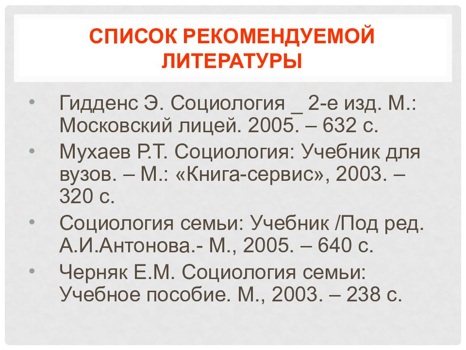 Гидденс Э. Социология _ 2-е изд. М.: Московский лицей. 2005. – 632 с. Мухаев Р.Т. Социология: Учебник для вузов. – М.: «Книга-сервис», 2003. – 320 с. Социология семьи: Учебник /Под ред. А.И.Антонова.- М., 2005. – 640 с. Черняк Е.М. Социология семьи: Учебное пособие. М., 2003. – 238 с.