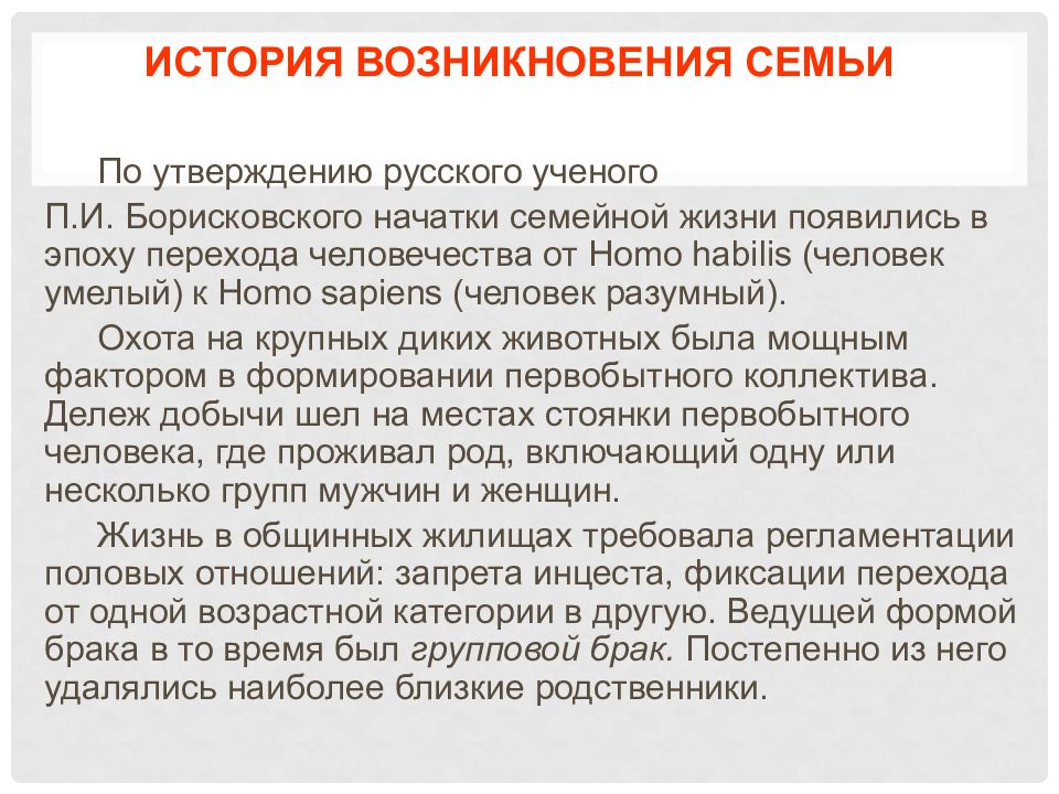 По утверждению русского ученого П.И. Борисковского начатки семейной жизни появились в эпоху перехода человечества от Homo habilis (человек умелый) к Homo sapiens (человек разумный). Охота на крупных диких животных была мощным фактором в формировании первобытного коллектива. Дележ добычи шел на местах стоянки первобытного человека, где проживал род, включающий одну или несколько групп мужчин и женщин. Жизнь в общинных жилищах требовала регламентации половых отношений: запрета инцеста, фиксации перехода от одной возрастной категории в другую. Ведущей формой брака в то время был групповой брак. Постепенно из него удалялись наиболее близкие родственники.