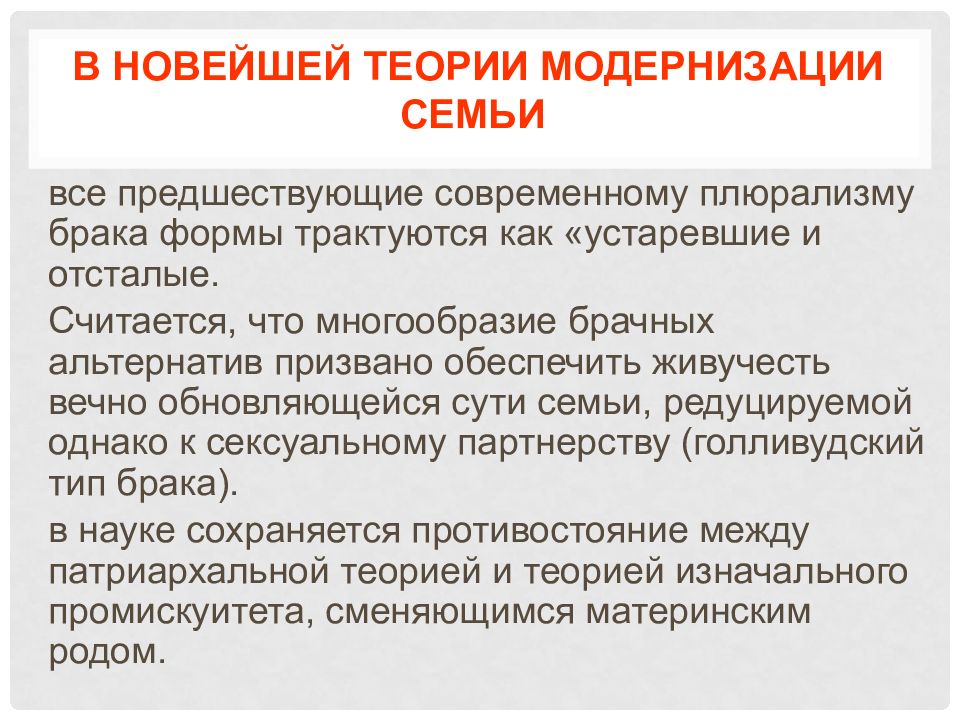 все предшествующие современному плюрализму брака формы трактуются как «устаревшие и отсталые. Считается, что многообразие брачных альтернатив призвано обеспечить живучесть вечно обновляющейся сути семьи, редуцируемой однако к сексуальному партнерству (голливудский тип брака). в науке сохраняется противостояние между патриархальной теорией и теорией изначального промискуитета, сменяющимся материнским родом.