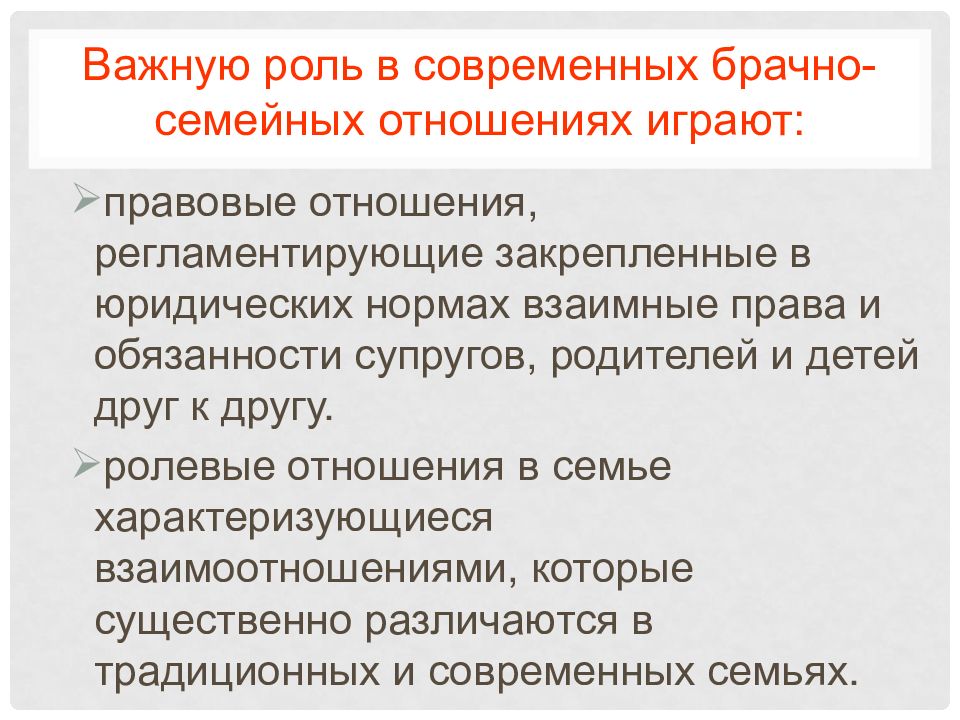 правовые отношения, регламентирующие закрепленные в юридических нормах взаимные права и обязанности супругов, родителей и детей друг к другу. ролевые отношения в семье характеризующиеся взаимоотношениями, которые существенно различаются в традиционных и современных семьях.