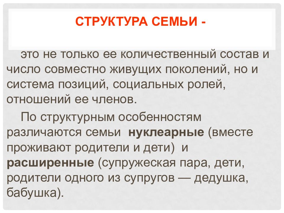 это не только ее количественный состав и число совместно живущих поколений, но и система позиций, социальных ролей, отношений ее членов. По структурным особенностям различаются семьи нуклеарные (вместе проживают родители и дети) и расширенные (супружеская пара, дети, родители одного из супругов — дедушка, бабушка).