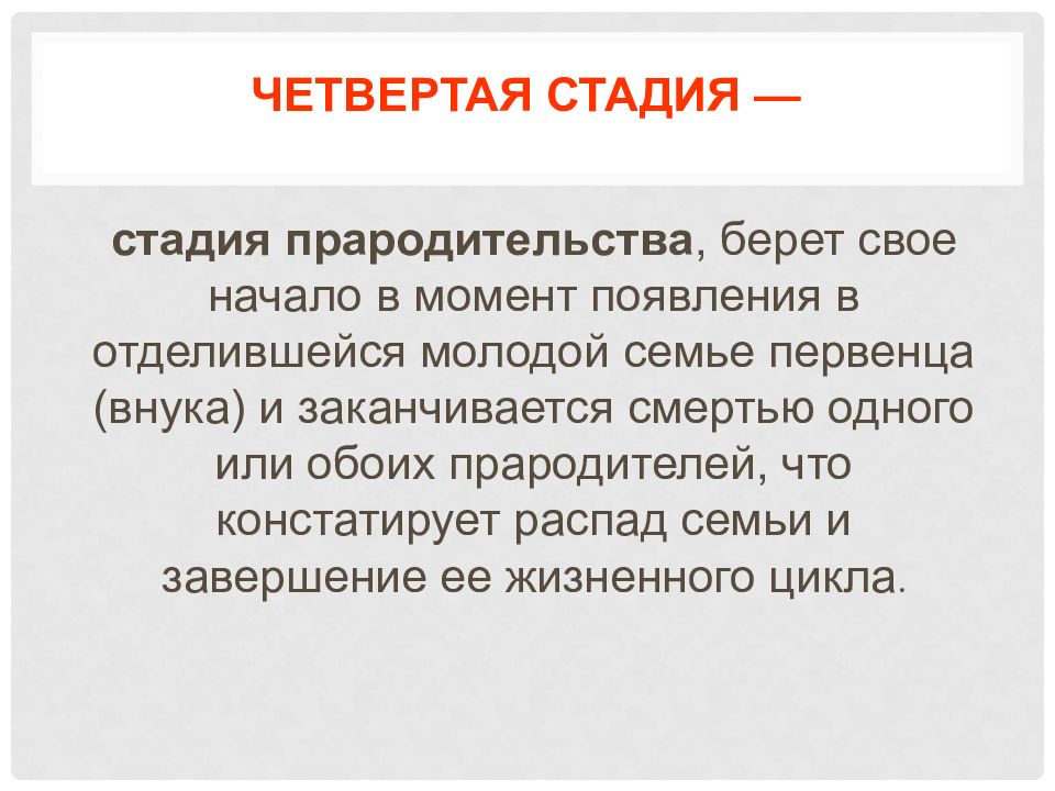 стадия прародительства, берет свое начало в момент появления в отделившейся молодой семье первенца (внука) и заканчивается смертью одного или обоих прародителей, что констатирует распад семьи и завершение ее жизненного цикла.