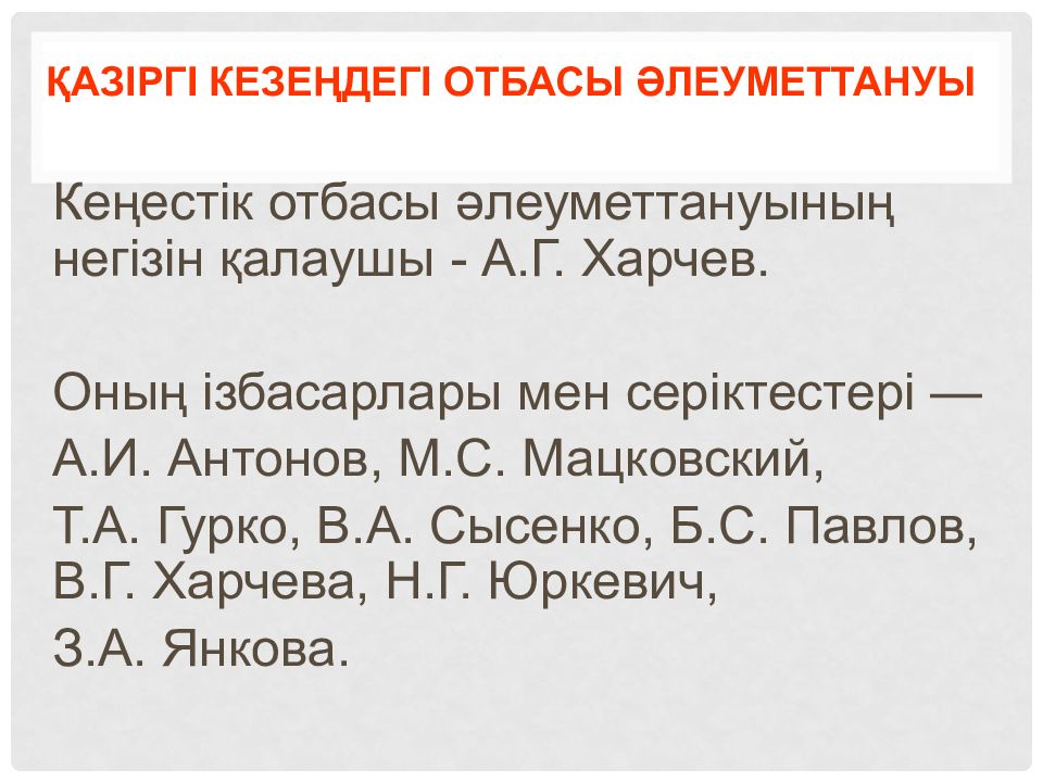 Кеңестік отбасы әлеуметтануының негізін қалаушы - А.Г. Харчев. Оның ізбасарлары мен серіктестері — А.И. Антонов, М.С. Мацковский, Т.А. Гурко, В.А. Сысенко, Б.С. Павлов, В.Г. Харчева, Н.Г. Юркевич, З.А. Янкова.