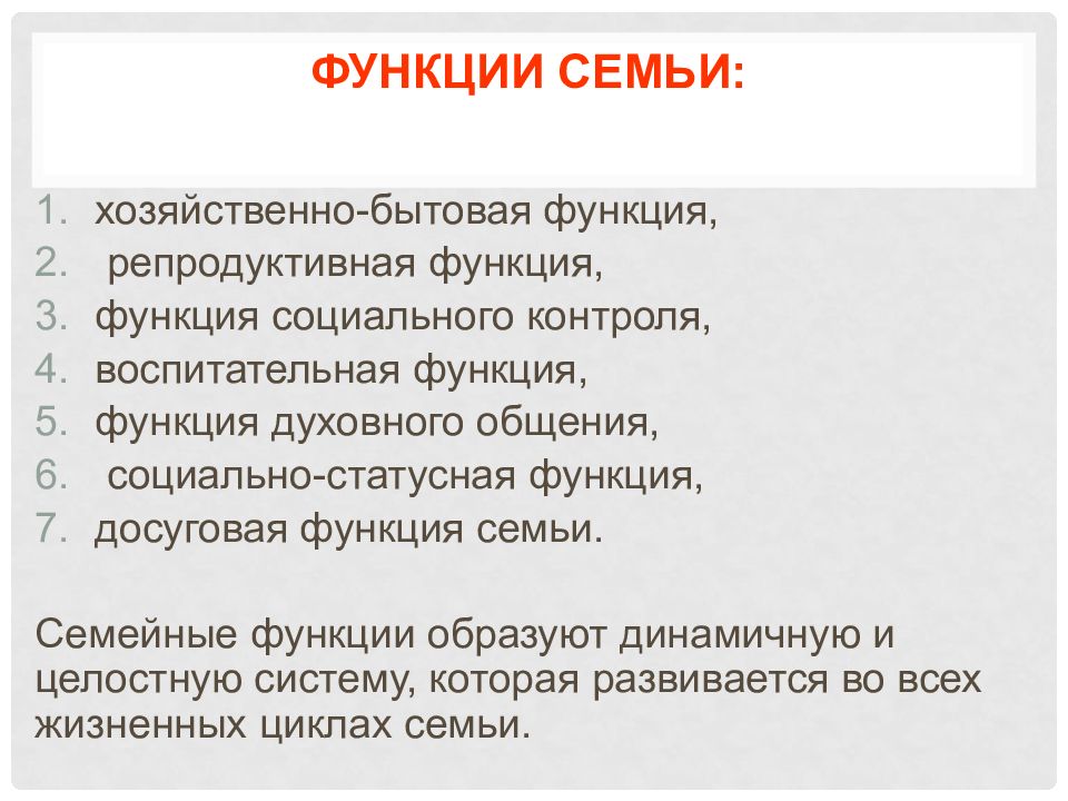 хозяйственно-бытовая функция, репродуктивная функция, функция социального контроля, воспитательная функция, функция духовного общения, социально-статусная функция, досуговая функция семьи. Семейные функции образуют динамичную и целостную систему, которая развивается во всех жизненных циклах семьи.