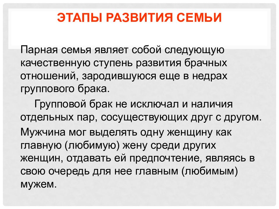 Парная семья являет собой следующую качественную ступень развития брачных отношений, зародившуюся еще в недрах группового брака. Групповой брак не исключал и наличия отдельных пар, сосуществующих друг с другом. Мужчина мог выделять одну женщину как главную (любимую) жену среди других женщин, отдавать ей предпочтение, являясь в свою очередь для нее главным (любимым) мужем.