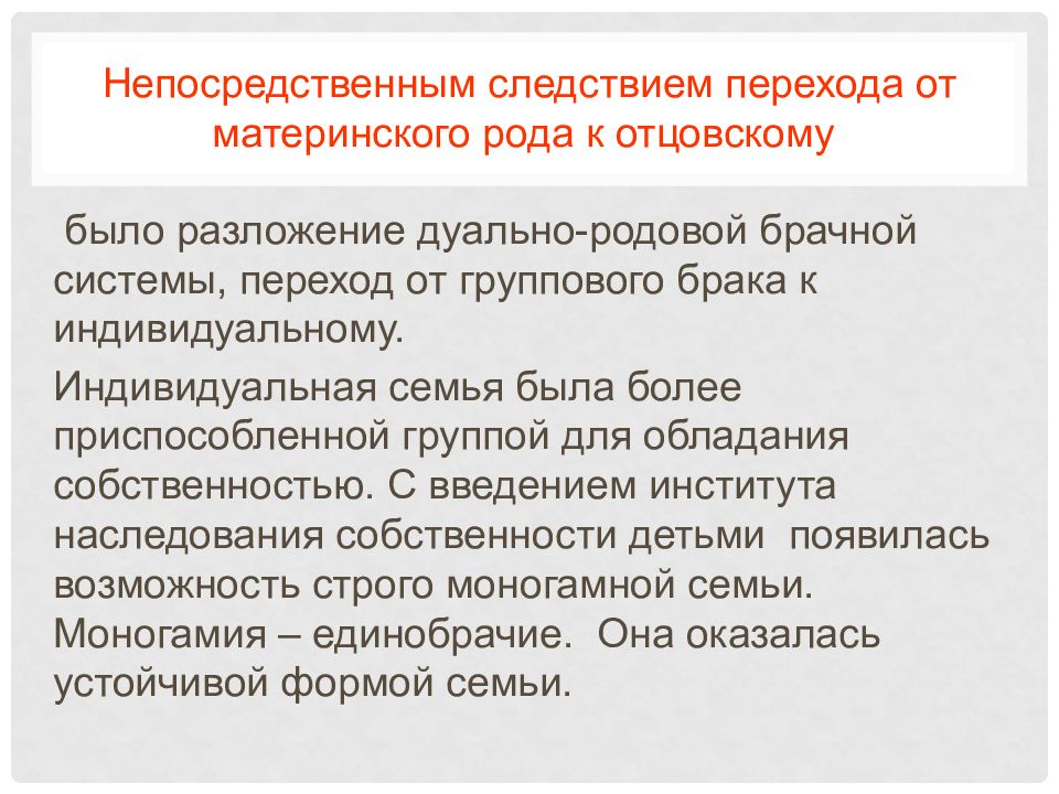 было разложение дуально-родовой брачной системы, переход от группового брака к индивидуальному. Индивидуальная семья была более приспособленной группой для обладания собственностью. С введением института наследования собственности детьми появилась возможность строго моногамной семьи. Моногамия – единобрачие. Она оказалась устойчивой формой семьи.