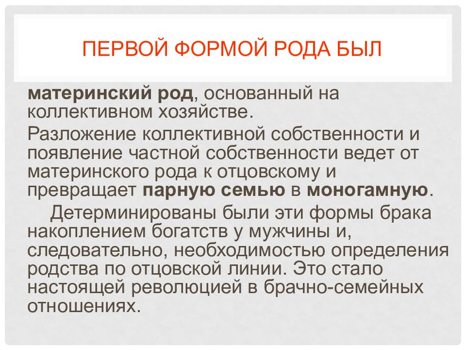 материнский род, основанный на коллективном хозяйстве. Разложение коллективной собственности и появление частной собственности ведет от материнского рода к отцовскому и превращает парную семью в моногамную. Детерминированы были эти формы брака накоплением богатств у мужчины и, следовательно, необходимостью определения родства по отцовской линии. Это стало настоящей революцией в брачно-семейных отношениях.