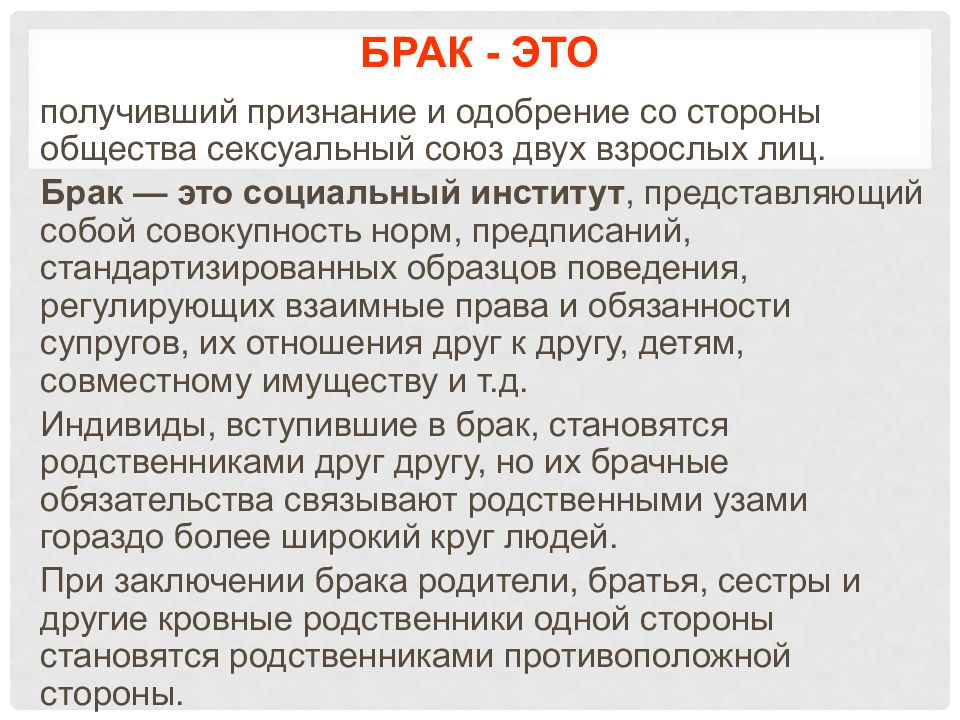 получивший признание и одобрение со стороны общества сексуальный союз двух взрослых лиц. Брак — это социальный институт, представляющий собой совокупность норм, предписаний, стандартизированных образцов поведения, регулирующих взаимные права и обязанности супругов, их отношения друг к другу, детям, совместному имуществу и т.д. Индивиды, вступившие в брак, становятся родственниками друг другу, но их брачные обязательства связывают родственными узами гораздо более широкий круг людей. При заключении брака родители, братья, сестры и другие кровные родственники одной стороны становятся родственниками противоположной стороны.