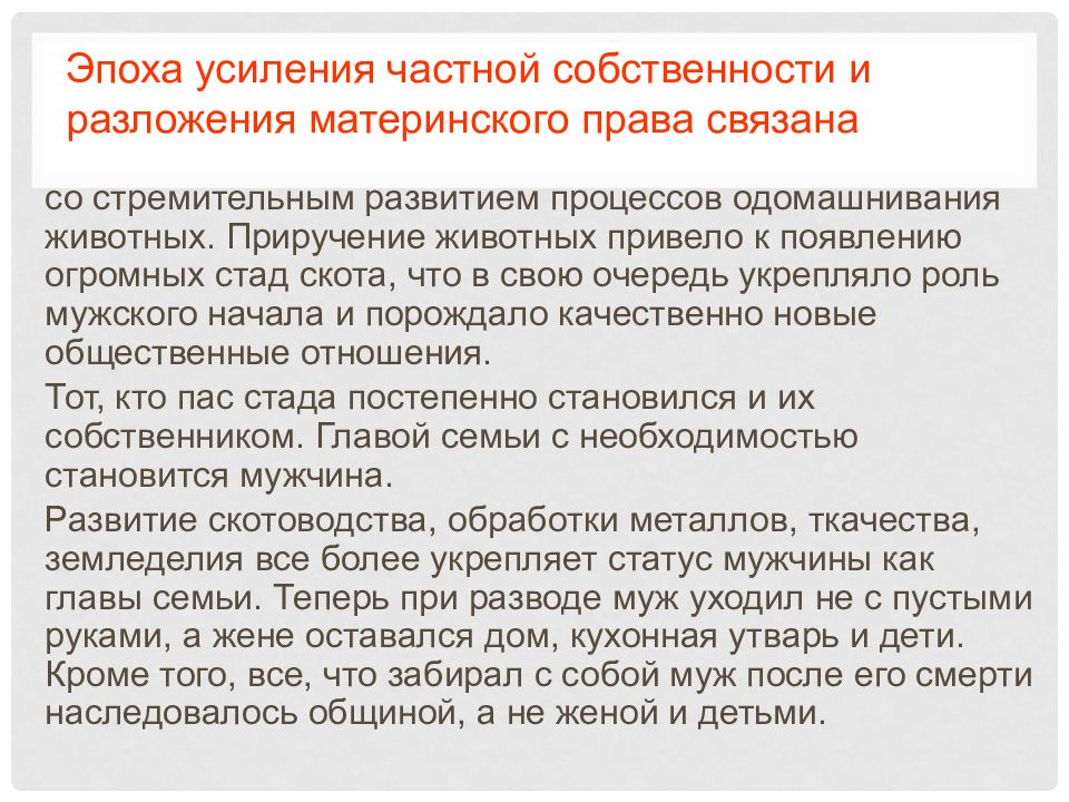 со стремительным развитием процессов одомашнивания животных. Приручение животных привело к появлению огромных стад скота, что в свою очередь укрепляло роль мужского начала и порождало качественно новые общественные отношения. Тот, кто пас стада постепенно становился и их собственником. Главой семьи с необходимостью становится мужчина. Развитие скотоводства, обработки металлов, ткачества, земледелия все более укрепляет статус мужчины как главы семьи. Теперь при разводе муж уходил не с пустыми руками, а жене оставался дом, кухонная утварь и дети. Кроме того, все, что забирал с собой муж после его смерти наследовалось общиной, а не женой и детьми.