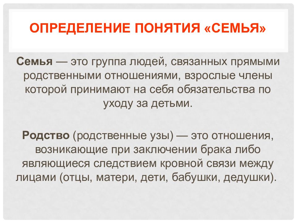 Семья — это группа людей, связанных прямыми родственными отношениями, взрослые члены которой принимают на себя обязательства по уходу за детьми. Родство (родственные узы) — это отношения, возникающие при заключении брака либо являющиеся следствием кровной связи между лицами (отцы, матери, дети, бабушки, дедушки).