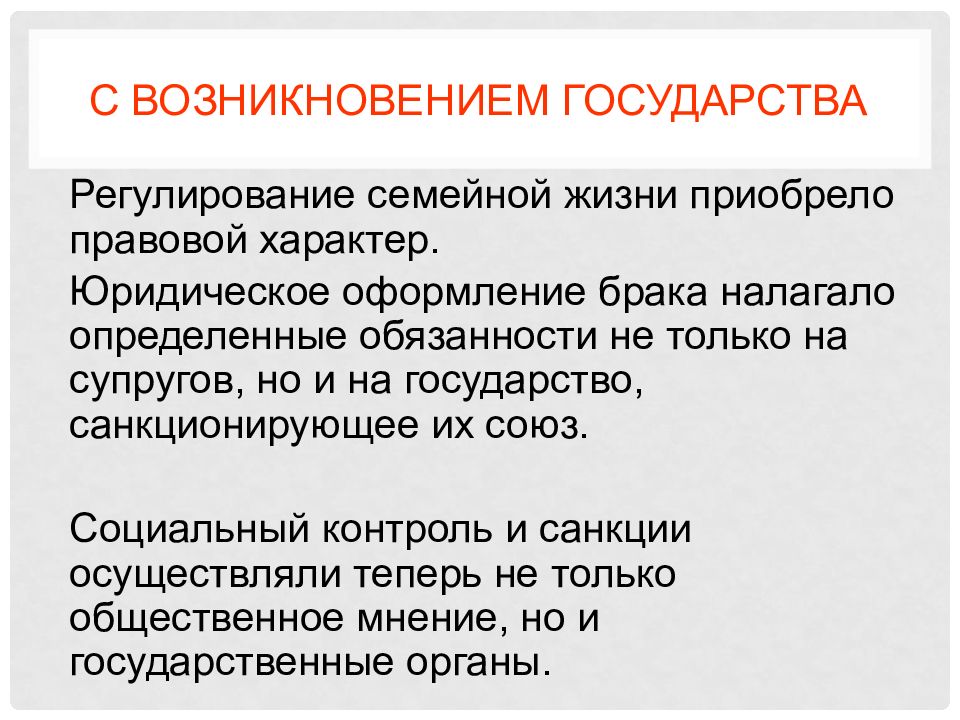 Р егулирование семейной жизни приобрело правовой характер. Юридическое оформление брака налагало определенные обязанности не только на супругов, но и на государство, санкционирующее их союз. Социальный контроль и санкции осуществляли теперь не только общественное мнение, но и государственные органы.
