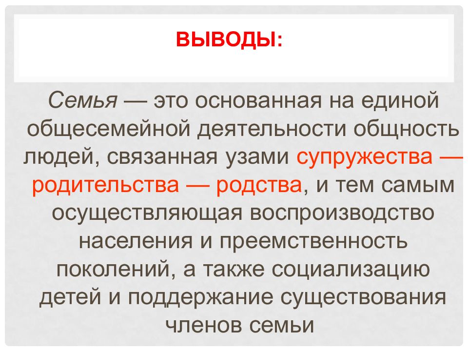 Семья — это основанная на единой общесемейной деятельности общность людей, связанная узами супружества — родительства — родства, и тем самым осуществляющая воспроизводство населения и преемственность поколений, а также социализацию детей и поддержание существования членов семьи