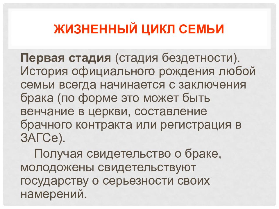 Первая стадия (стадия бездетности). История официального рождения любой семьи всегда начинается с заключения брака (по форме это может быть венчание в церкви, составление брачного контракта или регистрация в ЗАГСе). Получая свидетельство о браке, молодожены свидетельствуют государству о серьезности своих намерений.