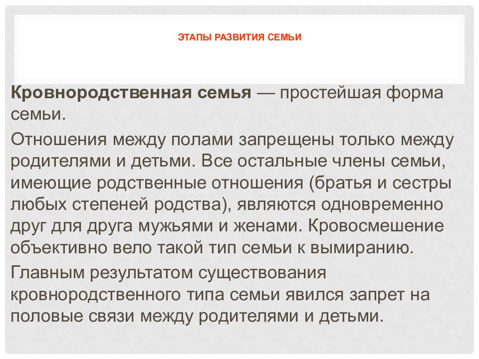 Кровнородственная семья — простейшая форма семьи. Отношения между полами запрещены только между родителями и детьми. Все остальные члены семьи, имеющие родственные отношения (братья и сестры любых степеней родства), являются одновременно друг для друга мужьями и женами. Кровосмешение объективно вело такой тип семьи к вымиранию. Главным результатом существования кровнородственного типа семьи явился запрет на половые связи между родителями и детьми.
