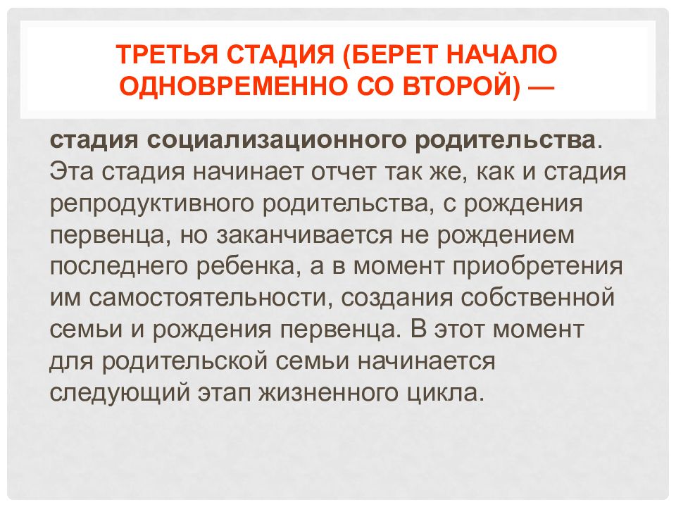 стадия социализационного родительства. Эта стадия начинает отчет так же, как и стадия репродуктивного родительства, с рождения первенца, но заканчивается не рождением последнего ребенка, а в момент приобретения им самостоятельности, создания собственной семьи и рождения первенца. В этот момент для родительской семьи начинается следующий этап жизненного цикла.